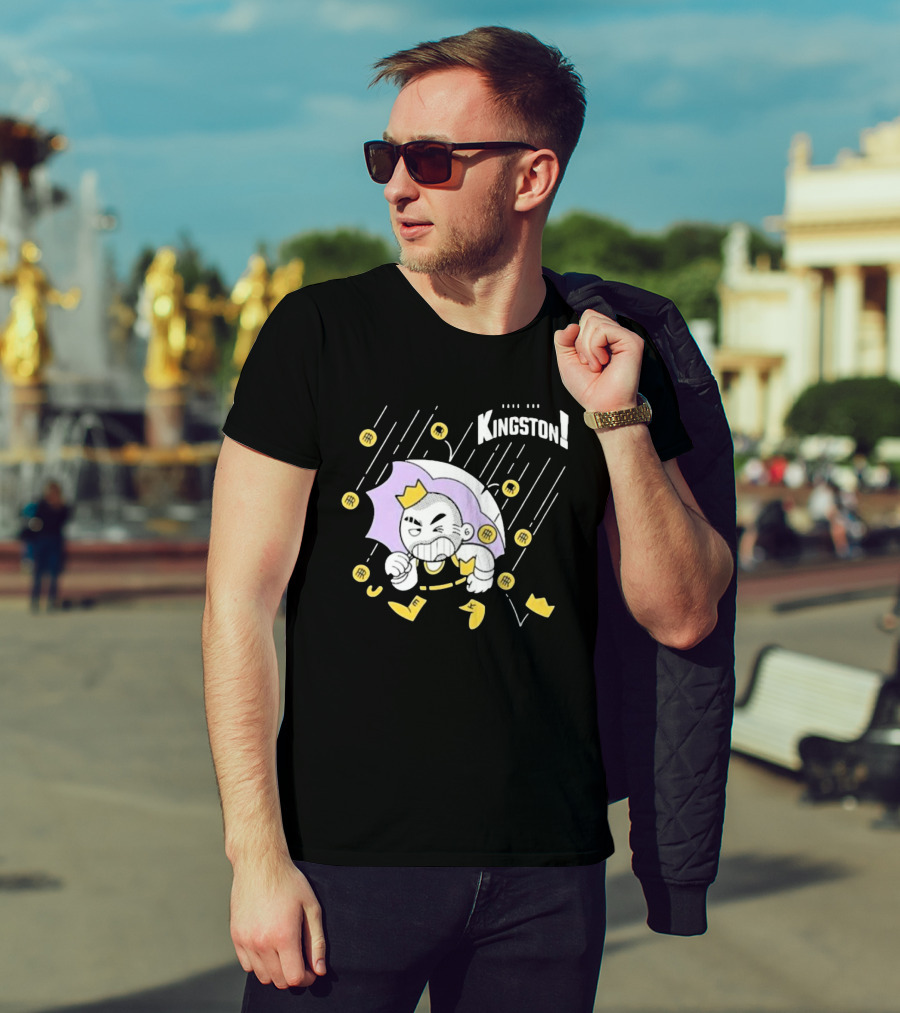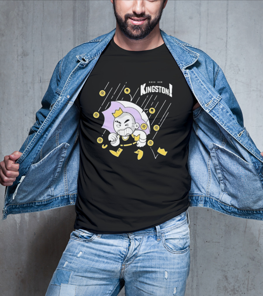 Bald Emo Kingston Character with Umbrella and Crown Symbols T-shirt — on-model holding jacket over shoulder.